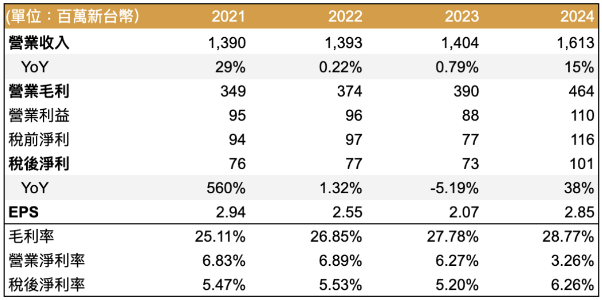 - 2024 年度營收 16 億台幣,較去年同期成長 14.8%,主因為外銷市場擴展及家用市場需求穩健。