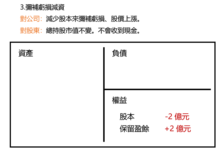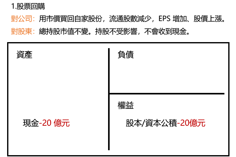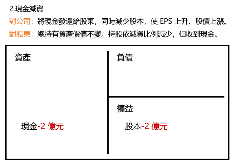 而對公司資產負債表的影響則是現金減少 2 億元,股本也同步減少 2 億元。
