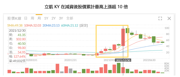比如 2021 年減資近 35% 的磷酸鋰電池材料製造商立凱 KY(櫃:5227),因打入多家電動車供應鏈,營運遇到轉機,決定發起減資打掉虧損。公司營運確實重回成長,2022 上半年營收年增超過 2 倍,帶動股價從減資後累計上漲最高超過 10 倍。
