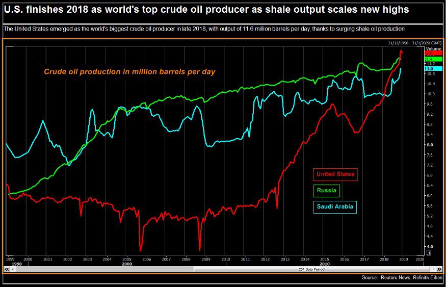據路透社(Reuters)報導,2019 年美國頁岩油產量約為 1200 萬桶/日(12 million bpd),已經成為全球最大的產油國,美方市佔率的持續攀升,也降低了俄羅斯在油價的話語權,更重要的是也影響了俄國的經濟命脈。所以不論是對俄羅斯或是沙國,頁岩油是雙方共同想要消滅的對象,而其中沙烏地阿拉伯在 2016 年試過一次卻失敗了。