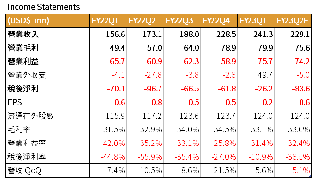 FY2023Q2 營收預計 2.15 億元~2.35 億元(QoQ-5%),毛利率 33~35%,稀釋後 EPS 虧損 0.08~0.16 元,營運將較 FY2023Q1 衰退。