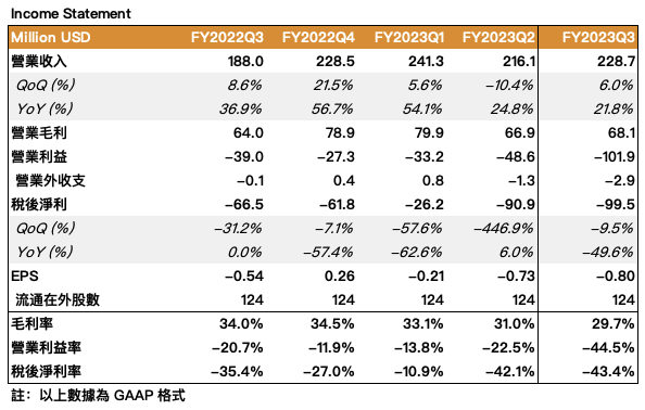預計 FY2023Q4 營收 2.12~2.32 億元,其中 8 吋廠將貢獻約 1~3% 營收;Non-GAAP 毛利率 29~31%。稀釋後 Non-GAAP EPS 虧損 0.17~0.23 元,毛利及獲利皆較本季衰退。