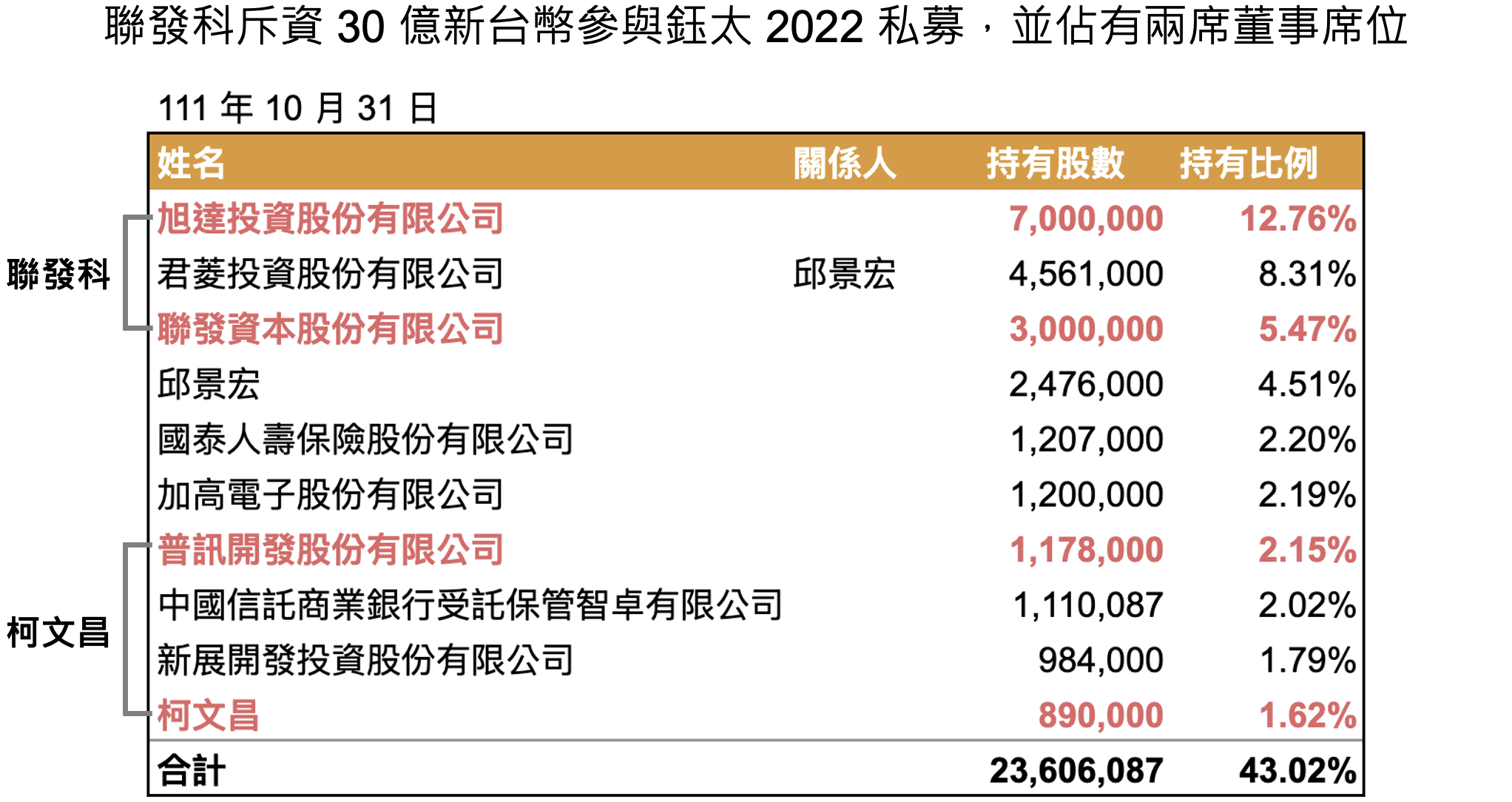 鈺太於 2022 年辦理私募,在聯發科入股後,經營層股權佔比下降 2~3 %